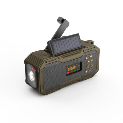 Nødradio vandtæt med digital display, bluetooth, lygte, læselampe, håndsving, solceller, USB-C og powerbank på 5000mAh batteri